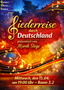Ein musikalischer Abend voller Begegnung und guter Stimmung: Marek Stege führt euch durch eine Liederreise durch Deutschland, bei der Musikstile wie Rock, Pop und weitere Genres aus verschiedenen Jahrzehnten miteinander verbunden werden. Durch Mitmach-Elemente werdet ihr selbst Teil des Geschehens und erlebt einen abwechslungsreichen Abend voller gemeinsamer Momente, bei dem der Spaß garantiert nicht zu kurz kommt.